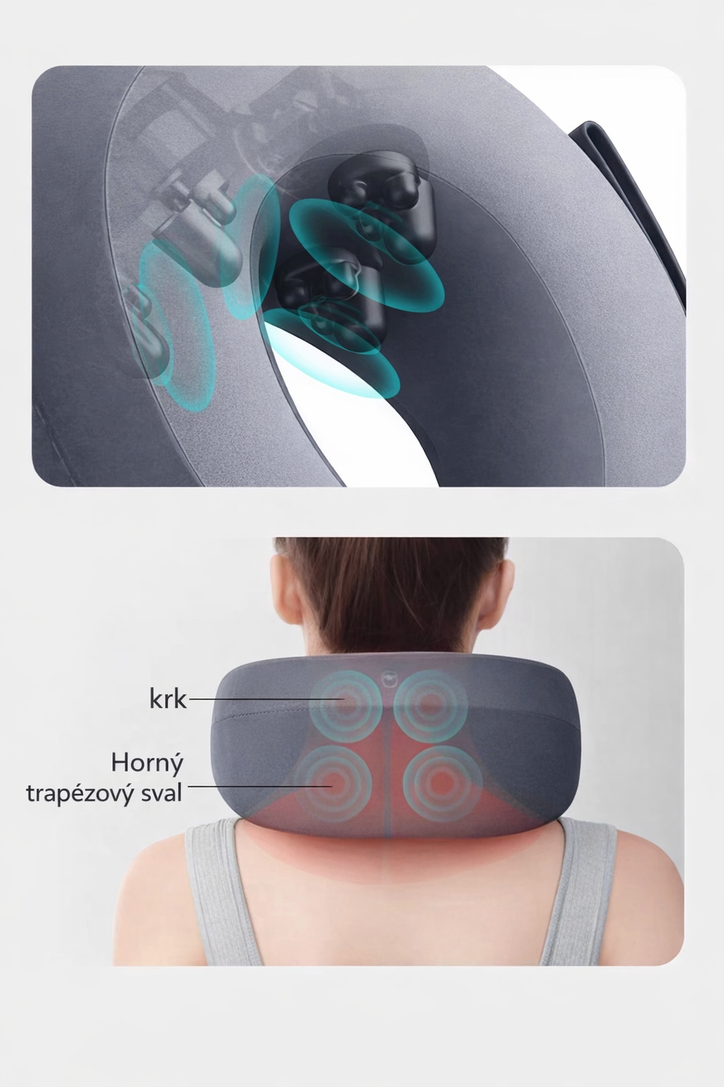 Masážny vankúš na krk v tvare písmena U s vibráciami a vyhrievaním Krčná chrbtica býva preťažená najmä pri dlhom sedení, šoférovaní a pri častom pozeraní do telefónu. Typicky sa to prejaví stuhnutosťou v šiji, „ťahaním“ do trapézov, citlivými ramenami, pocitom ťažkej hlavy, bolesťou pri otáčaní ...